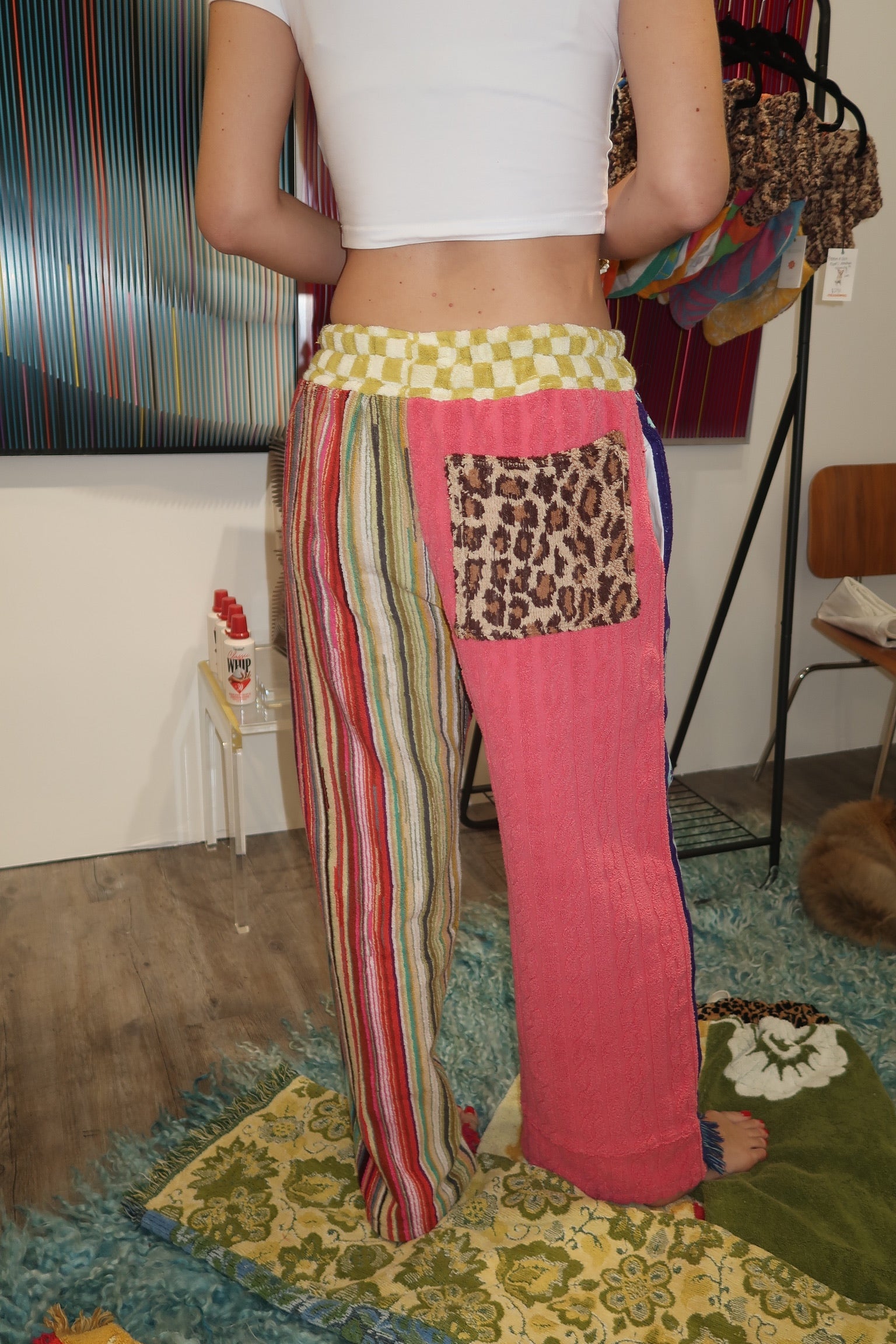 These ultra-comfy pants are upcycled from Mary's personal collection of vintage towels sourced globally. Each pair is a unique, one-of-a-kind garment, handmade domestically. With a baggier design, they comfortably fit women’s sizes S-L/XL and men’s S-M/L. On a 5’9” frame, they have a relaxed, baggy fit as shown. The more you size up, the baggier the fit.